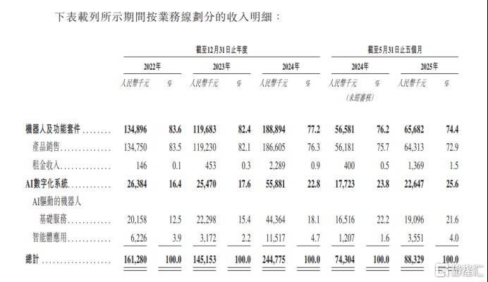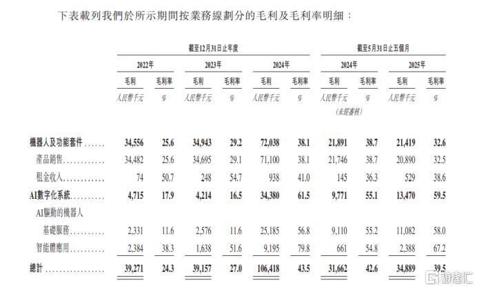 值得注意的是,从其营收结构来看,其主要提供机器人及功能套件,辅以AI 数字化系统的服务。而其AI数字化系统收入占比正快速提升,2025年前五个月达到25.6%,同时其来自该业务线的收入2022年至2024年的年复合增长率达到了45.5%,这样也验证了其解决方案的跨场景适用性和成长爆发力。