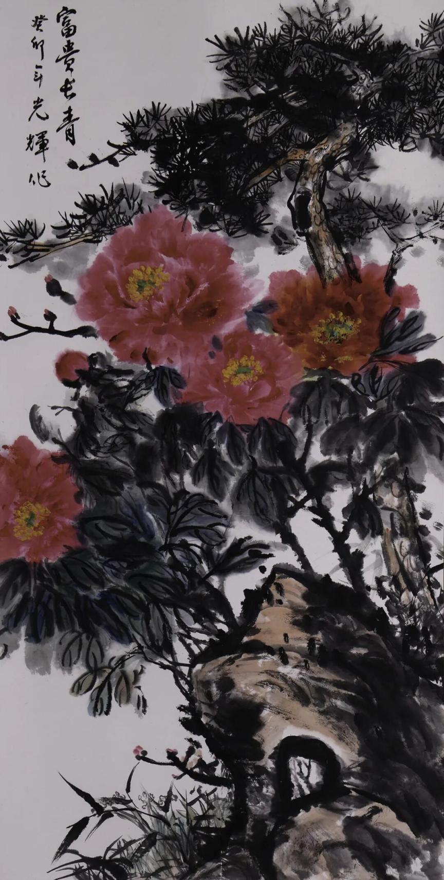 这幅《富贵长青》以牡丹、青松、灵石等元素创作。理念上借牡丹富贵不骄、青松廉洁有节、灵石坚守本心,融合成廉洁意象。思路是通过传统吉祥符号的创新组合,打破富贵与廉洁的认知边界。灵感源于对传统花木寓意的挖掘与廉洁文化的时代需求。其精神内涵是倡导在富贵中坚守廉洁操守,如青松磐石般永葆初心,价值导向为引导人们于物质富足时恪守廉洁底线,实现精神与物质的双重“长青”。