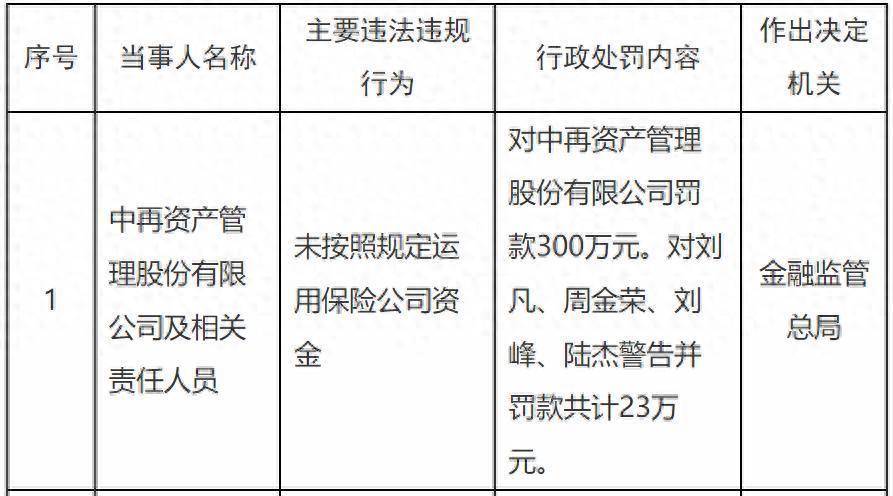10月11日,国家金融监督管理总局发布的行政处罚信息显示,因未按照规定运用保险公司资金,中再资产管理股份有限公司被罚款300万元,相关责任人员刘凡、周金荣、刘峰、陆杰被警告并罚款共计23万元。