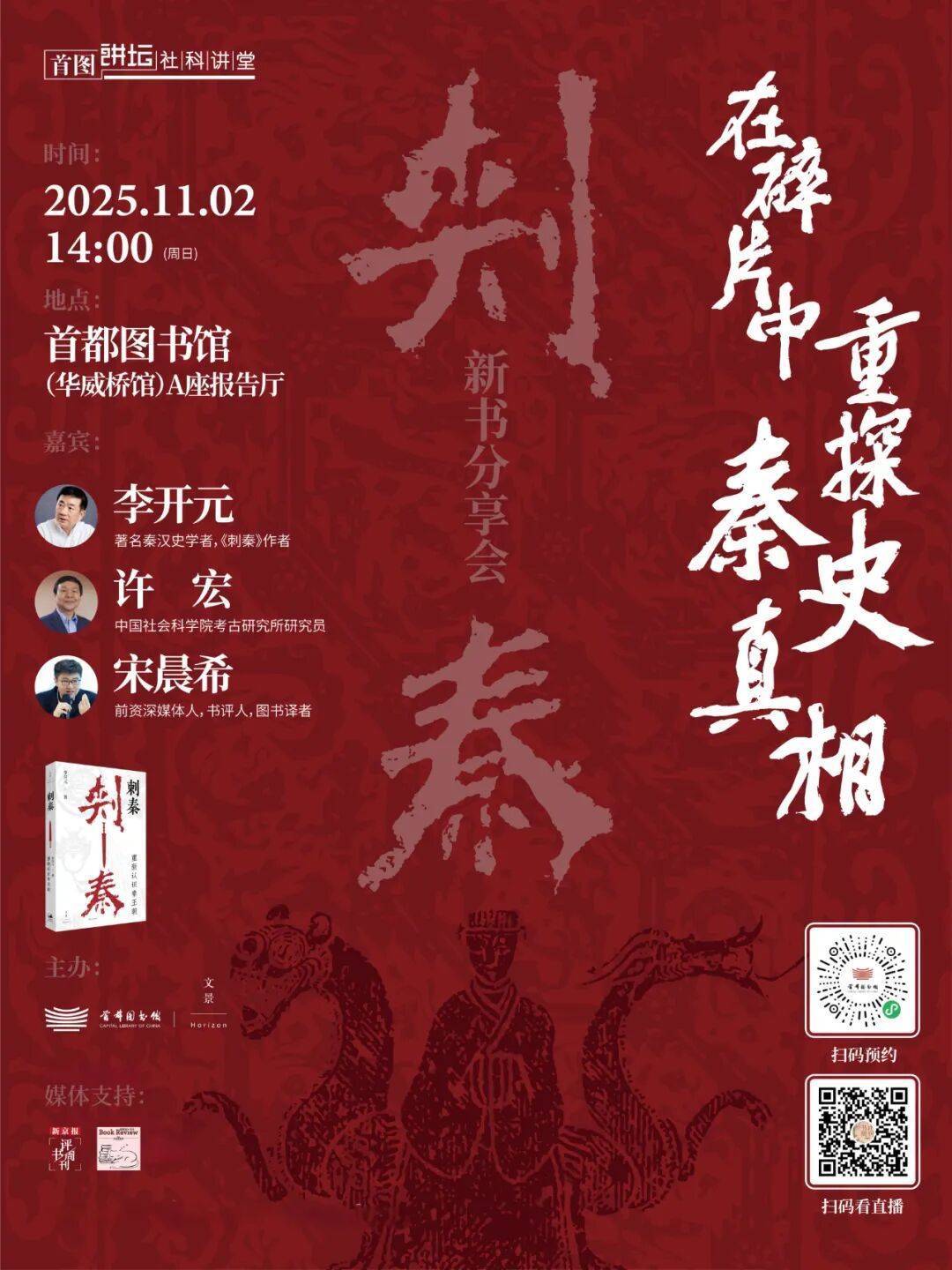 11月2日(周日)下午2点,我们特邀著名秦汉史学者、《刺秦》作者李开元教授,与中国社会科学院考古研究所研究员许宏,共话“在碎片中重探秦史真相”。资深媒体人宋晨希将主持本次对谈,他将与两位学者一道,带领我们化身历史侦探,从荆轲刺秦的惊心一刻,延伸到《谏逐客书》的深意,共同解码秦朝二世而亡的历史迷局。让我们一同重返那个决定中国历史走向的关键现场,感受历史在偶然与必然间的磅礴张力。